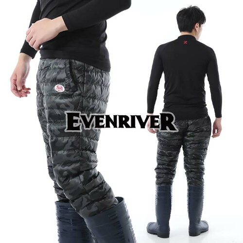 メーカー [イーブンリバー EVEN RIVER] 品番 [R-102] 品名 [ファイバーダウンパンツ] 生地 [ネイビー.ブラック.グレーはナイロン100%中綿ポリエステル100%] 生地 [カモブラックはポリエステル100%中綿ポリエステル100%] カラー [95カモブラック 8グレー 5ブラック 4紺] ふわりと軽いファイバーダウンパンツは肌さわりが良く軽いのが特徴です 冬場の作業着のインナーや、スポーツ観戦、キャンプ、アウトドアなど釣りなどでは大活躍すること間違いありません。