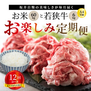 【ふるさと納税】【定期便 12回コース】福井県 坂井市産コシヒカリ 計60kg + 若狭牛A4等級がっつり 計6kg 国産和牛のすき焼き用や焼肉用等が6回、お米は白米10kg×6回お届け♪合計12か月(1年間)坂井市で大人気の定期便です。